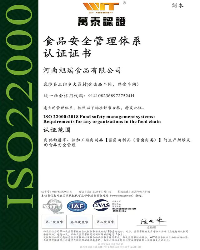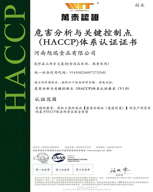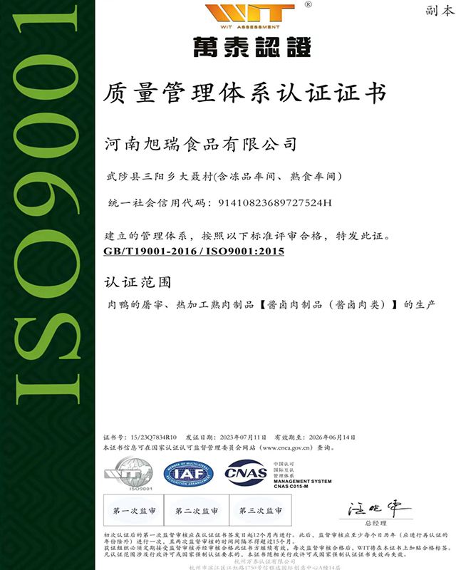 公司累计投资1.5亿元,建成现代化屠宰加工生产基地,引进先进成套生产线,达到国内领先生产加工水平。具备年屠宰2000万只肉鸭生产能力。拥有储存量3000吨的智能化,数字化冷链仓储.产品分别通过ISO9001质量管理体系、ISO22000食品安全管理体系和HACCP管理体系认证,获得绿色食品认证和出口食品生产企业备案证明。